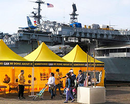 VM-teltet pryder Balboa Park og promenaden ved USS Midway i San Diego.